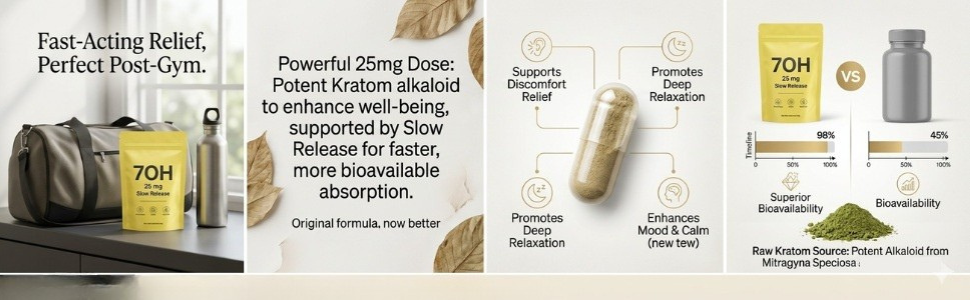 Our 25mg Slow Release tablets. A great way to get your 7-hydroxymitragynine dose in a faster, more bioavailable way than our original tablets. Perfect right after the gym or a rough day that you need relief fast.